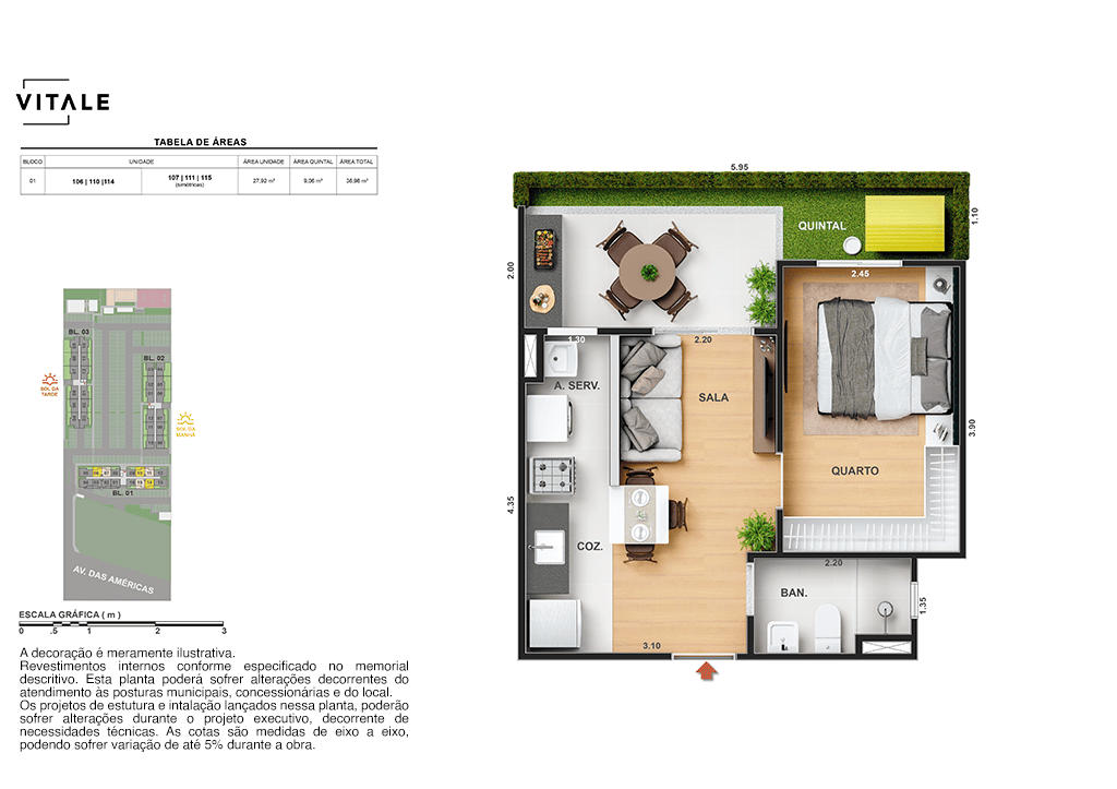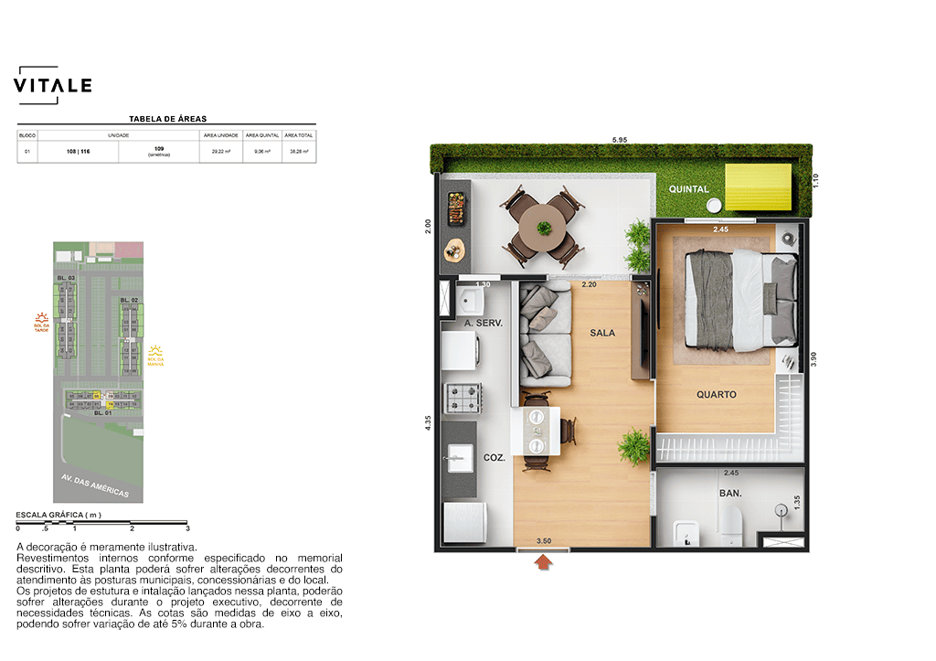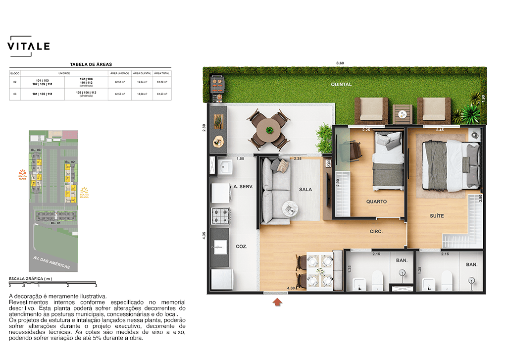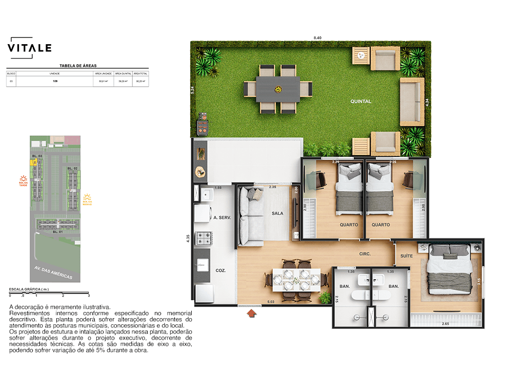 Todas as perspectivas, ilustrações e plantas contidas neste material foram concebidas como uma idealização artística de seus executores, de forma que ilustrem como pretendem que venha a ser o empreendimento em seu todo. O imóvel será construído com fiel observância das plantas aprovadas, das especificações e do memorial descritivo que integram o memorial de incorporação, podendo a PROMITENTE VENDEDORA, no entanto, por conveniência técnica, determinação do Poder Público ou exigência das empresas concessionárias de serviços públicos e Caixa Econômica Federal, promover modificações no projeto aprovado, sem que assista a qualquer das partes direito à indenização ou compensação de qualquer natureza. O paisagismo especificado nas ilustrações artísticas dos materiais publicitários é meramente enunciativo, de modo que o mesmo será executado com “mudas”, cabendo ao condomínio a responsabilidade de manter e zelar para que o referido paisagismo atinja ou se aproxime do nível sugerido no material exibido. As imagens, mobiliários, equipamentos e acabamentos são de caráter ilustrativo e não integram o contrato de compra e venda. As áreas poderão sofrer ajustes em razão de exigências técnicas ou legais, dentro das tolerâncias previstas pelas normas da ABNT. Projeto de construção aprovado pela Prefeitura Municipal da cidade do Rio de Janeiro, através do processo nº EISPRO2024/21600. Arquiteta responsável pelo Projeto: VIRGINIA LANNES EMANUEL CAU/RJ A4301-0. Engenheiro responsável pela Obra: CARLOS EDUARDO FÉLIX PAIVA CREA/RJ 2003103537. Propriedade de VITALE V20 EMPREENDIMENTOS IMOBILIARIOS LTDA.