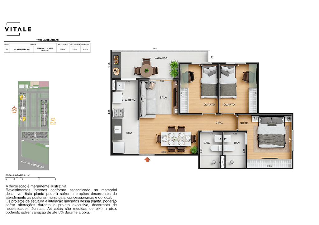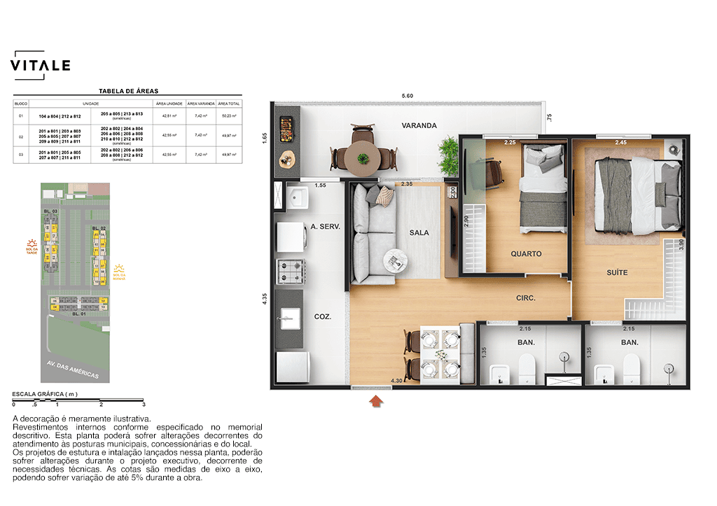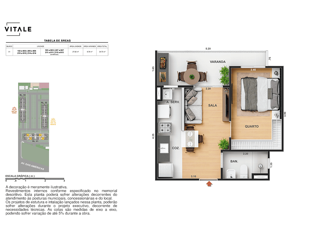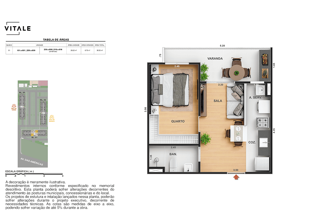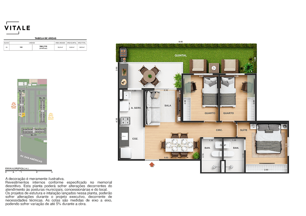 Todas as perspectivas, ilustrações e plantas contidas neste material foram concebidas como uma idealização artística de seus executores, de forma que ilustrem como pretendem que venha a ser o empreendimento em seu todo. O imóvel será construído com fiel observância das plantas aprovadas, das especificações e do memorial descritivo que integram o memorial de incorporação, podendo a PROMITENTE VENDEDORA, no entanto, por conveniência técnica, determinação do Poder Público ou exigência das empresas concessionárias de serviços públicos e Caixa Econômica Federal, promover modificações no projeto aprovado, sem que assista a qualquer das partes direito à indenização ou compensação de qualquer natureza. O paisagismo especificado nas ilustrações artísticas dos materiais publicitários é meramente enunciativo, de modo que o mesmo será executado com “mudas”, cabendo ao condomínio a responsabilidade de manter e zelar para que o referido paisagismo atinja ou se aproxime do nível sugerido no material exibido. As imagens, mobiliários, equipamentos e acabamentos são de caráter ilustrativo e não integram o contrato de compra e venda. As áreas poderão sofrer ajustes em razão de exigências técnicas ou legais, dentro das tolerâncias previstas pelas normas da ABNT. Projeto de construção aprovado pela Prefeitura Municipal da cidade do Rio de Janeiro, através do processo nº EISPRO2024/21600. Arquiteta responsável pelo Projeto: VIRGINIA LANNES EMANUEL CAU/RJ A4301-0. Engenheiro responsável pela Obra: CARLOS EDUARDO FÉLIX PAIVA CREA/RJ 2003103537. Propriedade de VITALE V20 EMPREENDIMENTOS IMOBILIARIOS LTDA.
